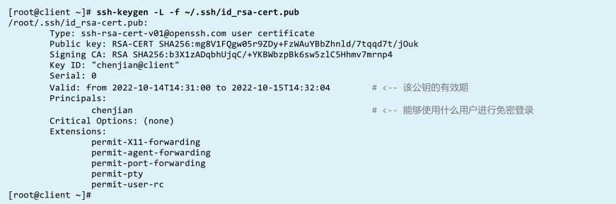 客户端: 查看该签名公钥的信息,了解该公钥到期时间以及能够使用什么用户进行免密登录; 要查看公钥信息,请使用 ssh-keygen -L 命令