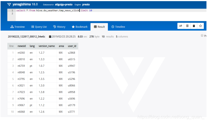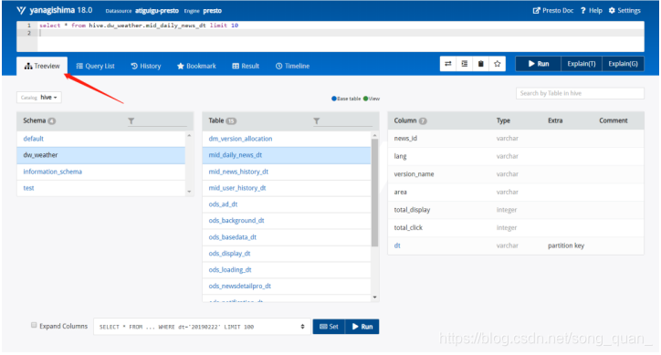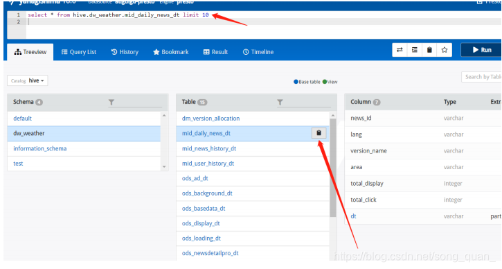 比如执行 select * from hive.dw_weather.tmp_news_click limit 10 ,这个句子里 Hive 这个