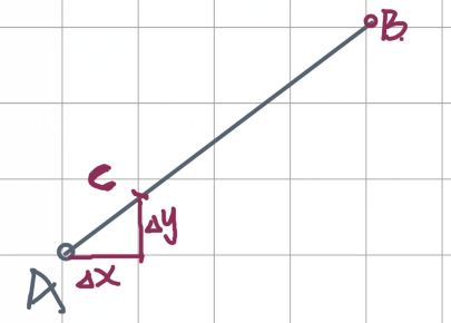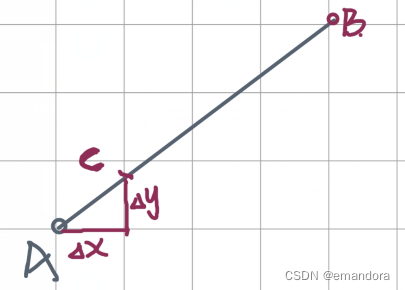 首先考虑直线斜率存在且绝对值<=1的情况,假设我们已知端点A坐标(x1, y1)以及端点B坐标(x2, y2),要绘制如上图所示的直线AB。当▲x=1时,▲y=(y2-y1)/(x2-x1)。此时从A点起始,我们每次给x增加1,y就会增加k。我们每次取x以及最接近y的整数构成的坐标点进行绘制,直到绘制到达B点。