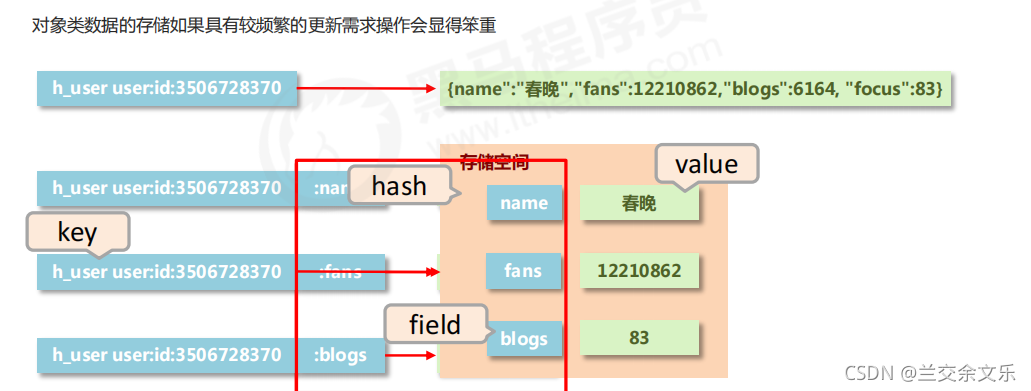 针对于对象数据类型采用json类型存储,对于频繁的更新的话会显的很笨重,因此,可以使用hash来存储