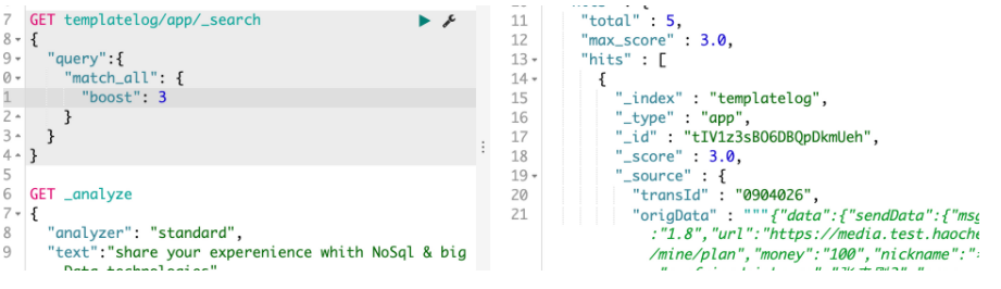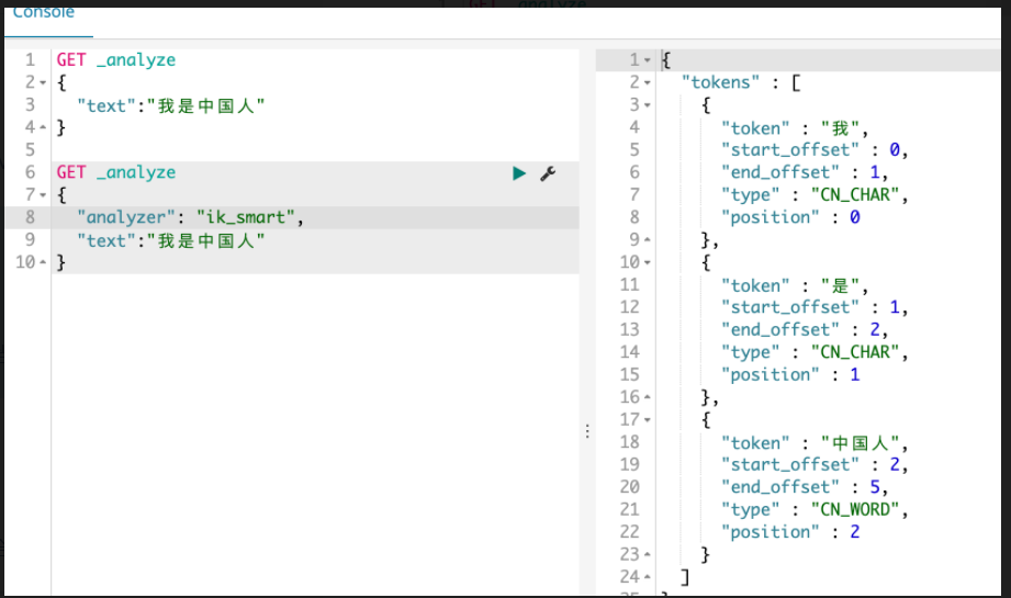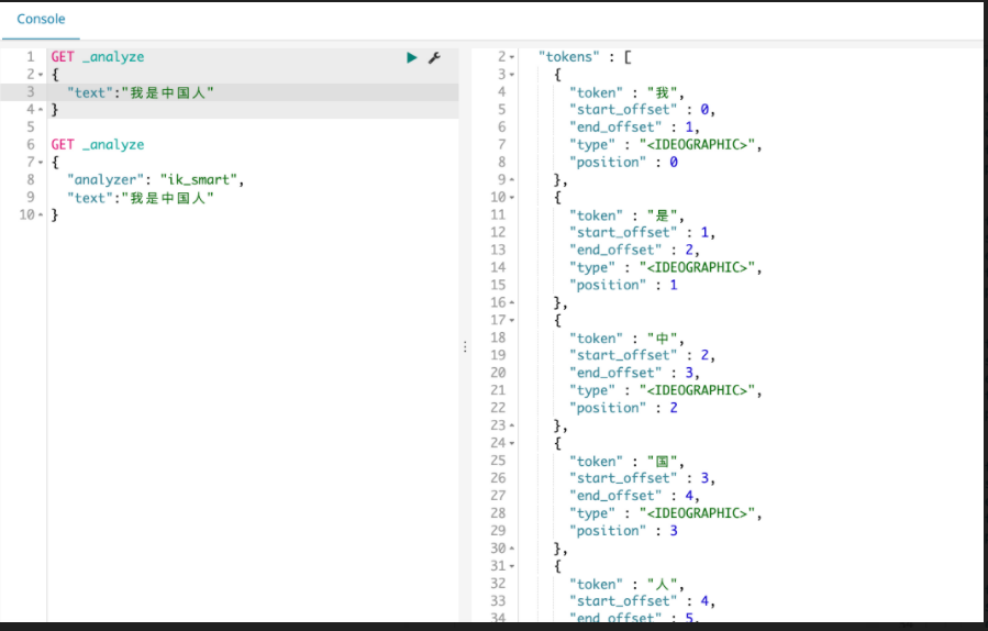 - 对指定字符串使用指定分析器进行分析,直接展示分析结果