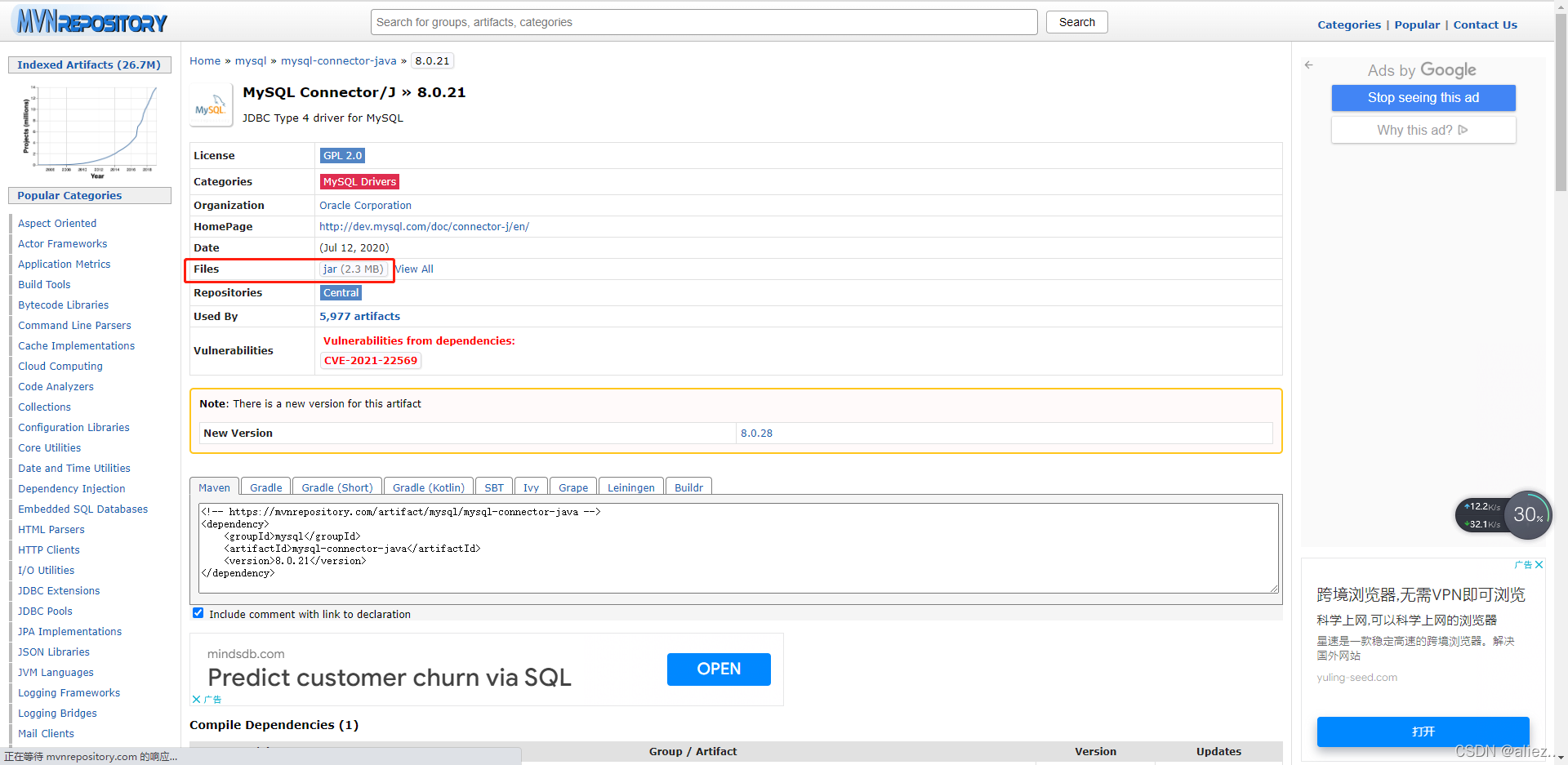 (1)例如数据库版本5.7,在maven仓库搜索mysql,https://mvnrepository.com/