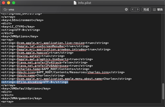 proxy - SSL Proxying Settings - SSL Proxying - Add,Host填写*,Port填写443Charles.app右键显示包内容,打开info.plist,添加vmoption字段,设置对应的值为-Dfile.encoding=UTF-8