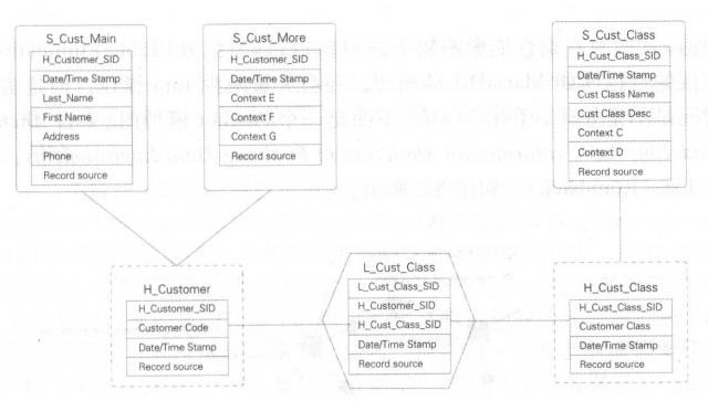 - Link - 链接表:代表 Hub 之间的关系。这里与 ER 模型最大的区别是将关系作为一个独立的单元抽象,可以提升模型的扩展性。它可以直接描述 1:1、1:2和n:n的关系,而不需要做任何变更。它由 Hub的代理键、装载时间、数据来源组成。