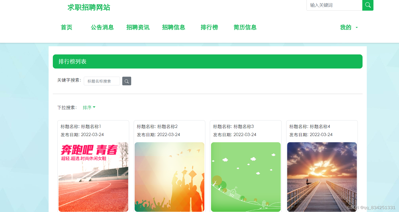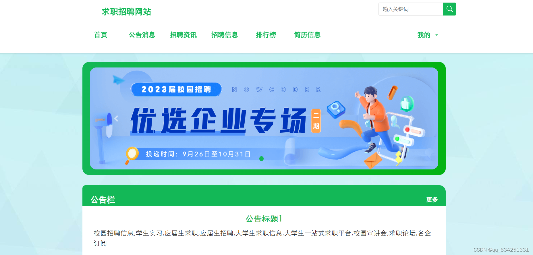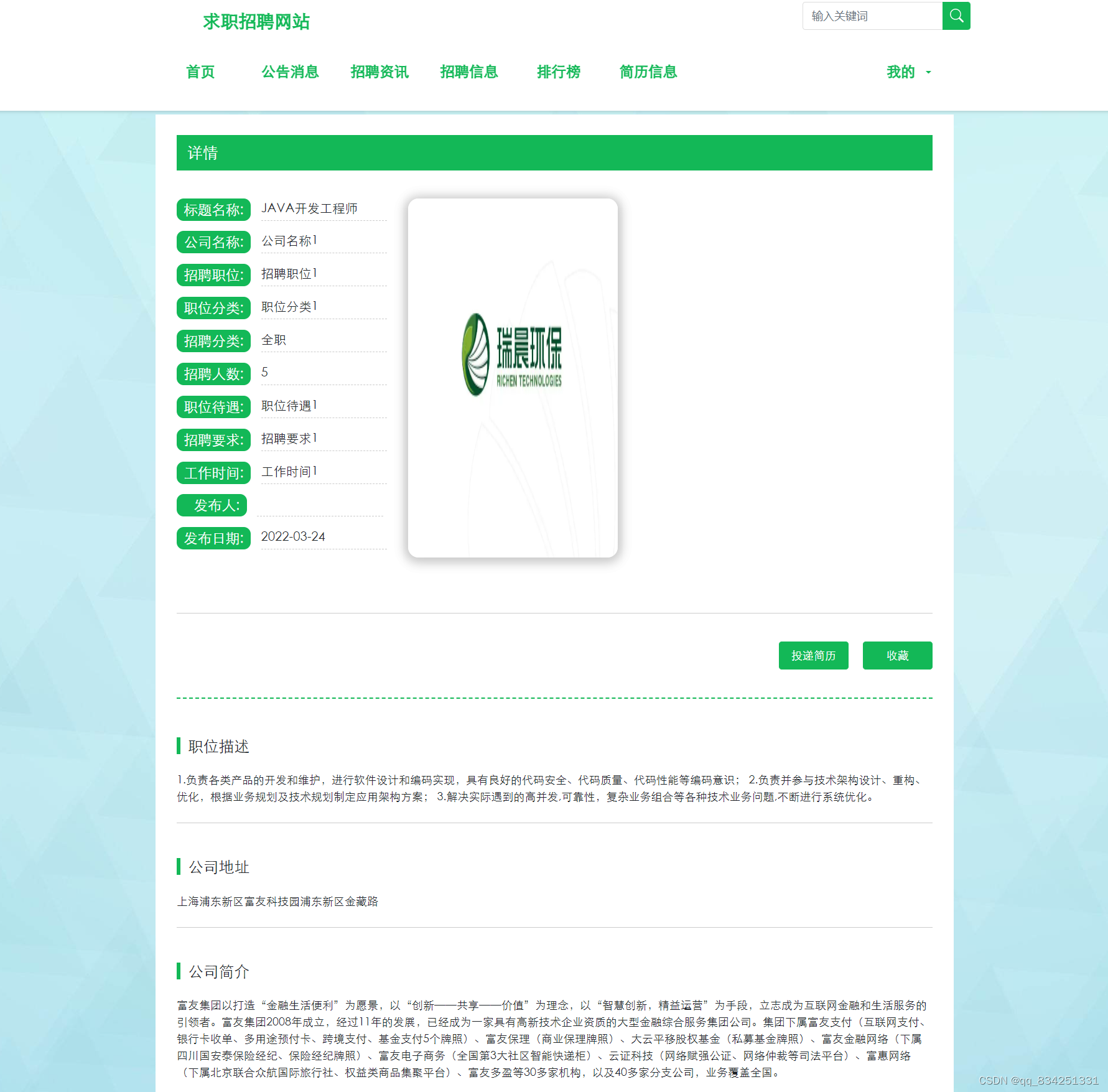 (2)前台用户:首页、公告消息、招聘资讯、招聘信息、排行榜、简历信息、我的(我的账户、我的收藏、个人中心、退出)。