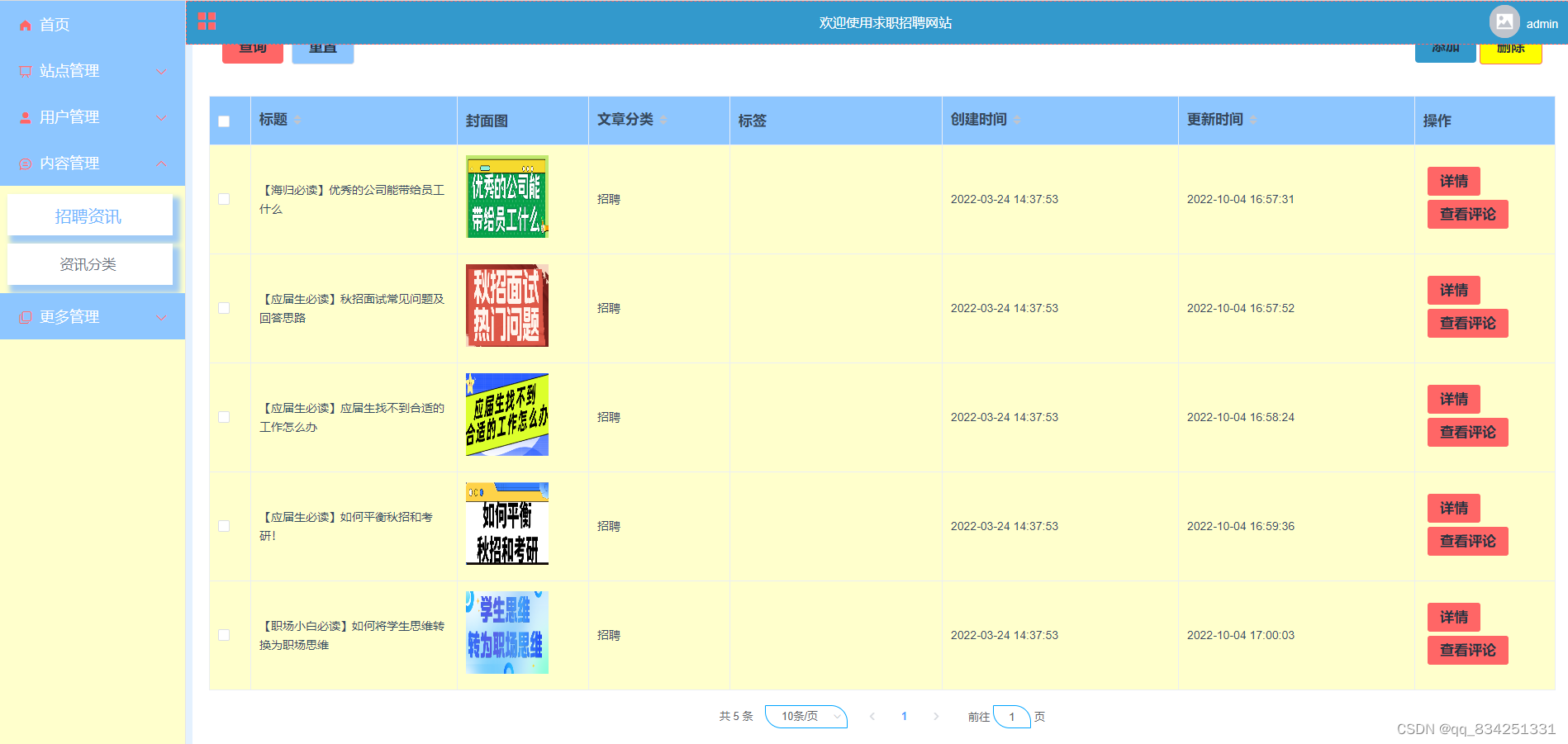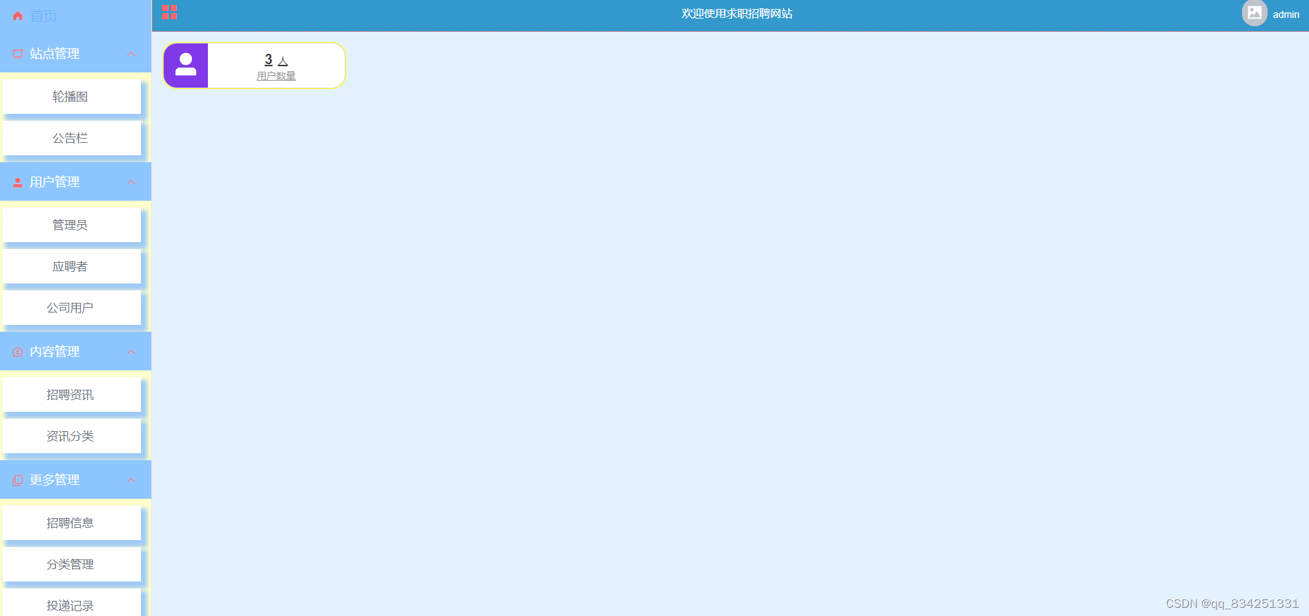 (1)管理员模块:首页、站点管理(轮播图、公告栏)用户管理(管理员、应聘者、公司用户)、内容管理(招聘资讯、资讯分类)、更多管理(招聘信息、分类管理、投递记录、举报信息、排行榜、简历信息)等功能。