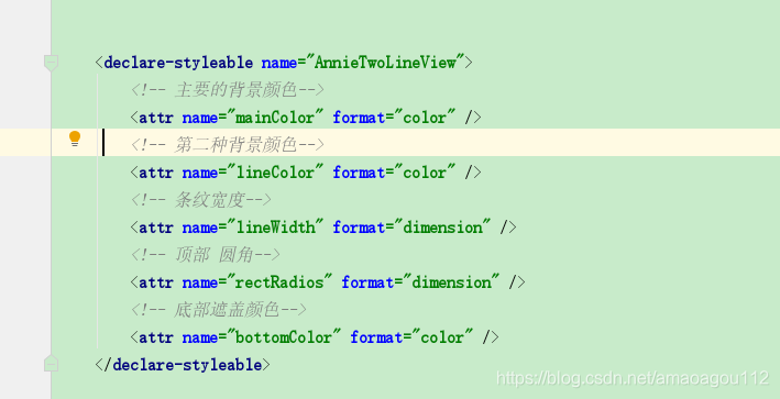 经过第一步的分析,有几个属性是需要在布局里进行赋值的,这些属性我们都定义在attr.xml中: