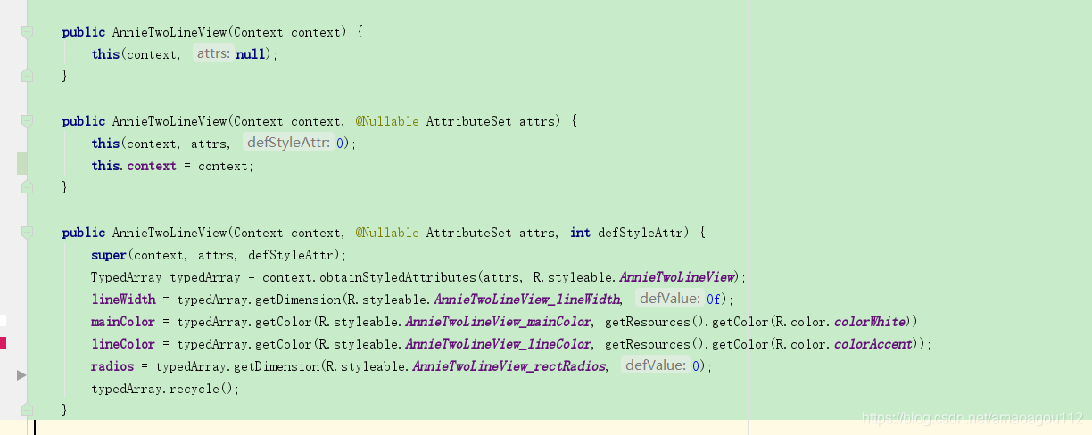 TypedArray typedArray = context.obtainStyledAttributes(attrs, R.styleable.AnnieTwoLineView);