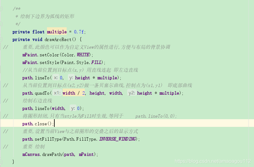 这里我们引入了一个新的对象Path,不规则图形的使用就是基于它来实现。基于Path我们可以实现很多奇妙的效果,在这里我们先练一下手。