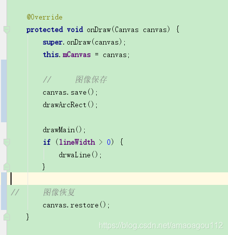 }还没完呢,裁剪的操作比较奇妙,需要我们在裁剪之前进行视图的保存,在裁剪,绘制之后进行视图的恢复,因此,我们改变了onDraw()里图层的绘制顺序: