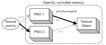 如下图所示表示同时使用了两个PBO。在glTexSubImage2D将像素数据从PBO拷贝出来的同时,另一份像素数据写进了另一个PBO。即在第n帧时,PBO1用于glTexSubImage2D,而PBO2用于生成一个新的纹理对象了。再到n+1帧时,两个PBO则互换了角色。由于异步DMA传递,像素数据的更新和拷贝过程可同时进行,即CPU将纹理源更新到PBO,同时GPU将从另一PBO中拷贝出纹理,从而提高处理速度。