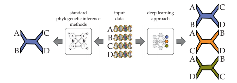 系统发生学 系统发生学是一种进化树,模拟了一组分类单元的进化历史。系统发育推断问题涉及从所研究的类群中获得的数据(通常是分子序列)建立系统发育。图3说明了四个类群的系统发育推理问题;在这种情况下,它可以被视为三种可能的拓扑之间的分类问题。然而,分类方法有一个主要的限制,即它们不能推断分支长度,也不能扩展到非常少的分类单元,因为可能的拓扑(类)的数量随着这个变量以超指数增长。但也许更重要的是,像深度学习模型这样的分类器需要训练数据,而在这个领域中几乎不可能获得已知真正系统发育的基准数据。对于复杂版本的系统发育推理问题,需要更真实的仿真协议。最后,从某种意义上说,对单个基因的系统发育推理本身就是一个简化的问题:从全基因组数据推断单个系统发育引入了复杂性,即不同的基因可能有不同的历史,或者真正的系统发育可能是一个网络,而不是一棵树。由于这些原因,深度学习要么成功有限,要么局限于主要推理任务之外的小的子问题。