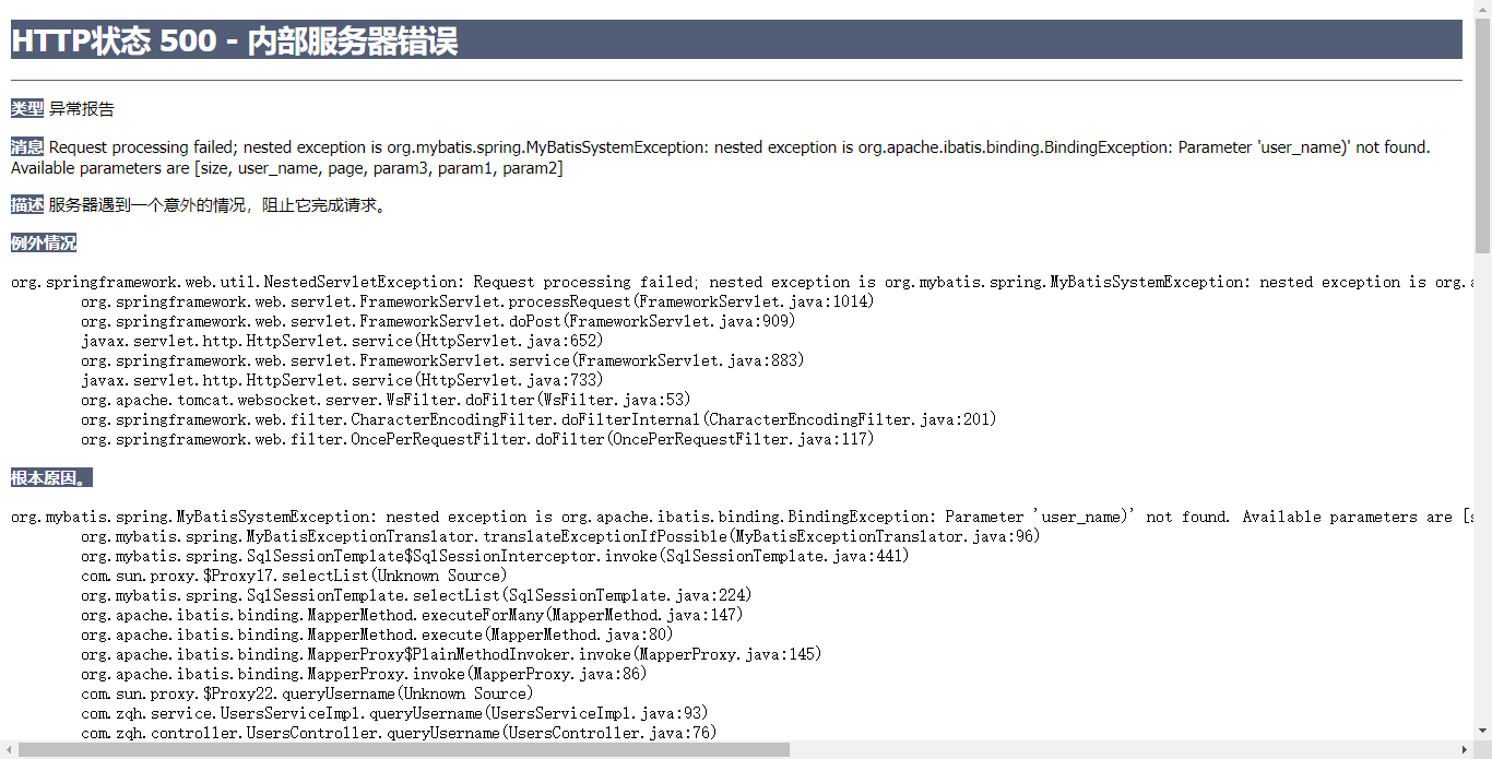 org.mybatis.spring.MyBatisSystemException: nested exception is org.apache.ibatis.binding.BindingException: Parameter 'user_name)' not found. Available parameters are [size, user_name, page, param3, param1, param2] org.mybatis.spring.MyBatisExceptionTranslator.translateExceptionIfPossible(MyBatisExceptionTranslator.java:96) org.mybatis.spring.SqlSessionTemplate$SqlSessionInterceptor.invoke(SqlSessionTemplate.java:441) com.sun.proxy.$Proxy17.selectList(Unknown Source) org.mybatis.spring.SqlSessionTemplate.selectList(SqlSessionTemplate.java:224) org.apache.ibatis.binding.MapperMethod.executeForMany(MapperMethod.java:147) org.apache.ibatis.binding.MapperMethod.execute(MapperMethod.java:80) org.apache.ibatis.binding.MapperProxy$PlainMethodInvoker.invoke(MapperProxy.java:145) org.apache.ibatis.binding.MapperProxy.invoke(MapperProxy.java:86) com.sun.proxy.$Proxy22.queryUsername(Unknown Source) com.zqh.service.UsersServiceImpl.queryUsername(UsersServiceImpl.java:93) com.zqh.controller.UsersController.queryUsername(UsersController.java:76) sun.reflect.NativeMethodAccessorImpl.invoke0(Native Method) sun.reflect.NativeMethodAccessorImpl.invoke(NativeMethodAccessorImpl.java:62) sun.reflect.DelegatingMethodAccessorImpl.invoke(DelegatingMethodAccessorImpl.java:43) java.lang.reflect.Method.invoke(Method.java:498) org.springframework.web.method.support.InvocableHandlerMethod.doInvoke(InvocableHandlerMethod.java:205) org.springframework.web.method.support.InvocableHandlerMethod.invokeForRequest(InvocableHandlerMethod.java:150) org.springframework.web.servlet.mvc.method.annotation.ServletInvocableHandlerMethod.invokeAndHandle(ServletInvocableHandlerMethod.java:117) org.springframework.web.servlet.mvc.method.annotation.RequestMappingHandlerAdapter.invokeHandlerMethod(RequestMappingHandlerAdapter.java:895) org.springframework.web.servlet.mvc.method.annotation.RequestMappingHandlerAdapter.handleInternal(RequestMappingHandlerAdapter.java:808) org.springframework.web.servlet.mvc.method.AbstractHandlerMethodAdapter.handle(AbstractHandlerMethodAdapter.java:87) org.springframework.web.servlet.DispatcherServlet.doDispatch(DispatcherServlet.java:1067) org.springframework.web.servlet.DispatcherServlet.doService(DispatcherServlet.java:963) org.springframework.web.servlet.FrameworkServlet.processRequest(FrameworkServlet.java:1006) org.springframework.web.servlet.FrameworkServlet.doPost(FrameworkServlet.java:909) javax.servlet.http.HttpServlet.service(HttpServlet.java:652) org.springframework.web.servlet.FrameworkServlet.service(FrameworkServlet.java:883) javax.servlet.http.HttpServlet.service(HttpServlet.java:733) org.apache.tomcat.websocket.server.WsFilter.doFilter(WsFilter.java:53) org.springframework.web.filter.CharacterEncodingFilter.doFilterInternal(CharacterEncodingFilter.java:201) org.springframework.web.filter.OncePerRequestFilter.doFilter(OncePerRequestFilter.java:117)
