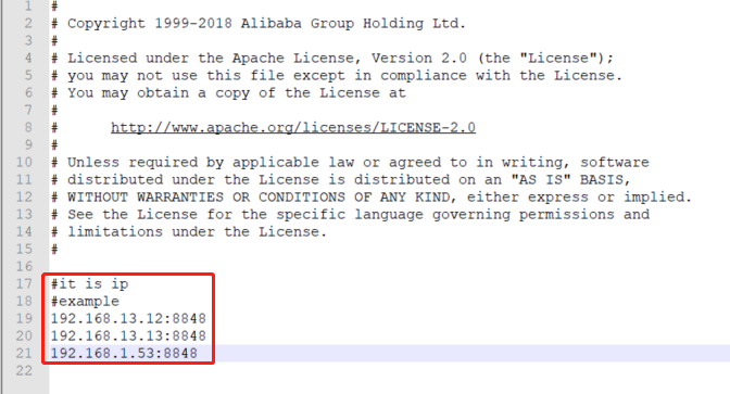 拷贝/usr/local/fire/nacos/conf下的cluster.conf.example为cluster.conf,在cluster.conf添加集群配置,配置如下图: