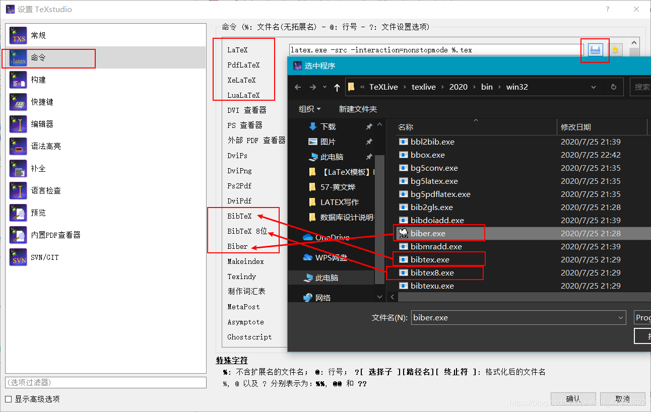 - 点击选项栏的选项-->设置TexStudio...左边栏选择命令,进行如下图所示这些地方的配置,设置配置文件的文件夹为你刚刚安装的TexLive的安装文件夹。