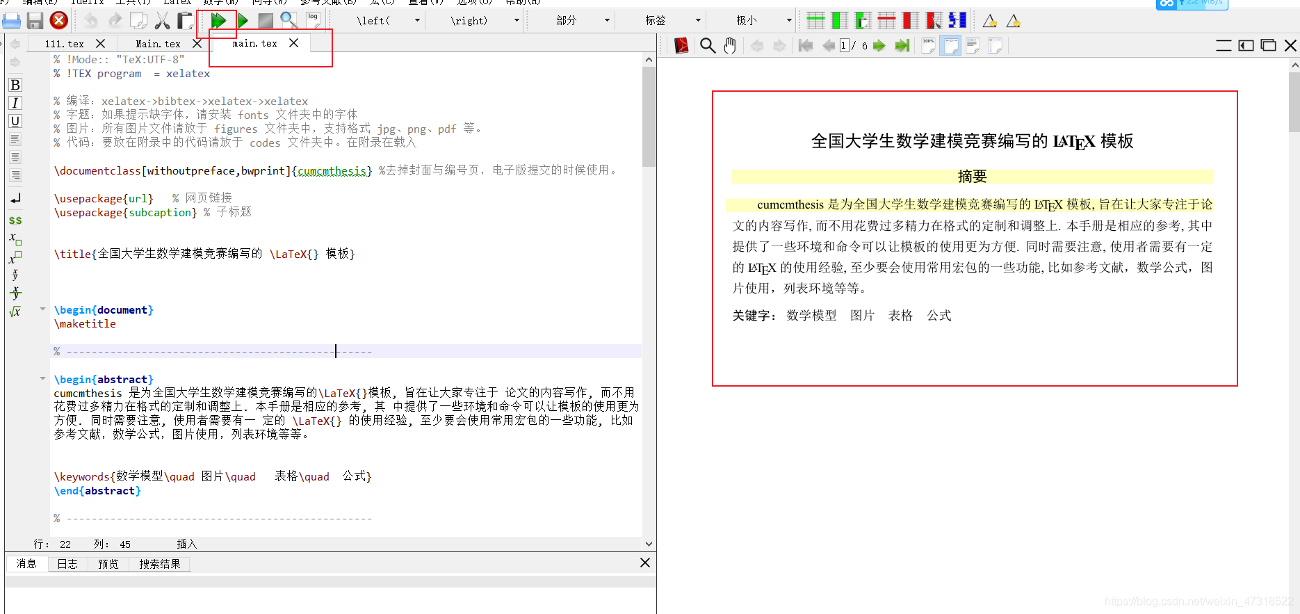 - 找到解压文件夹里的main.tex文件,把这个文件右键用texstudio打开或直接拖拽进texstudio,单击绿色的 构建并查看 按钮 或者 按F5键,即可显示编辑效果,如没有报错,则LATEX安装完成。