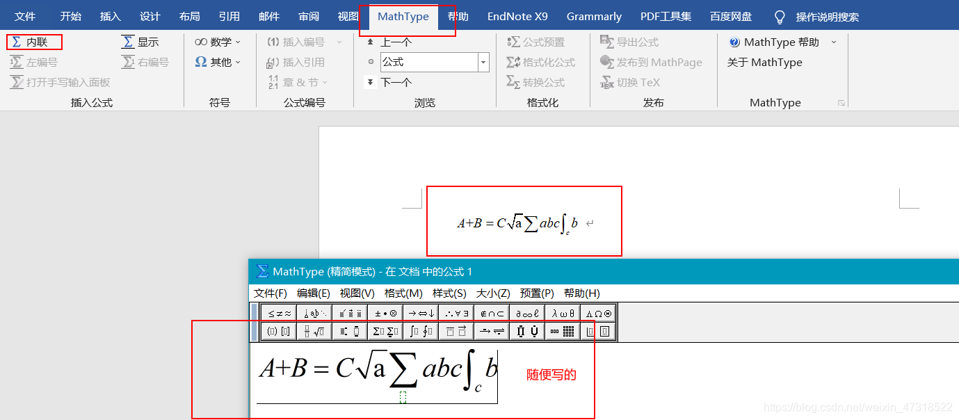 - 然后打开word就可以看到菜单栏有MathType这一选项卡,点击,选择内联,选择试用或者精简模式即可使用