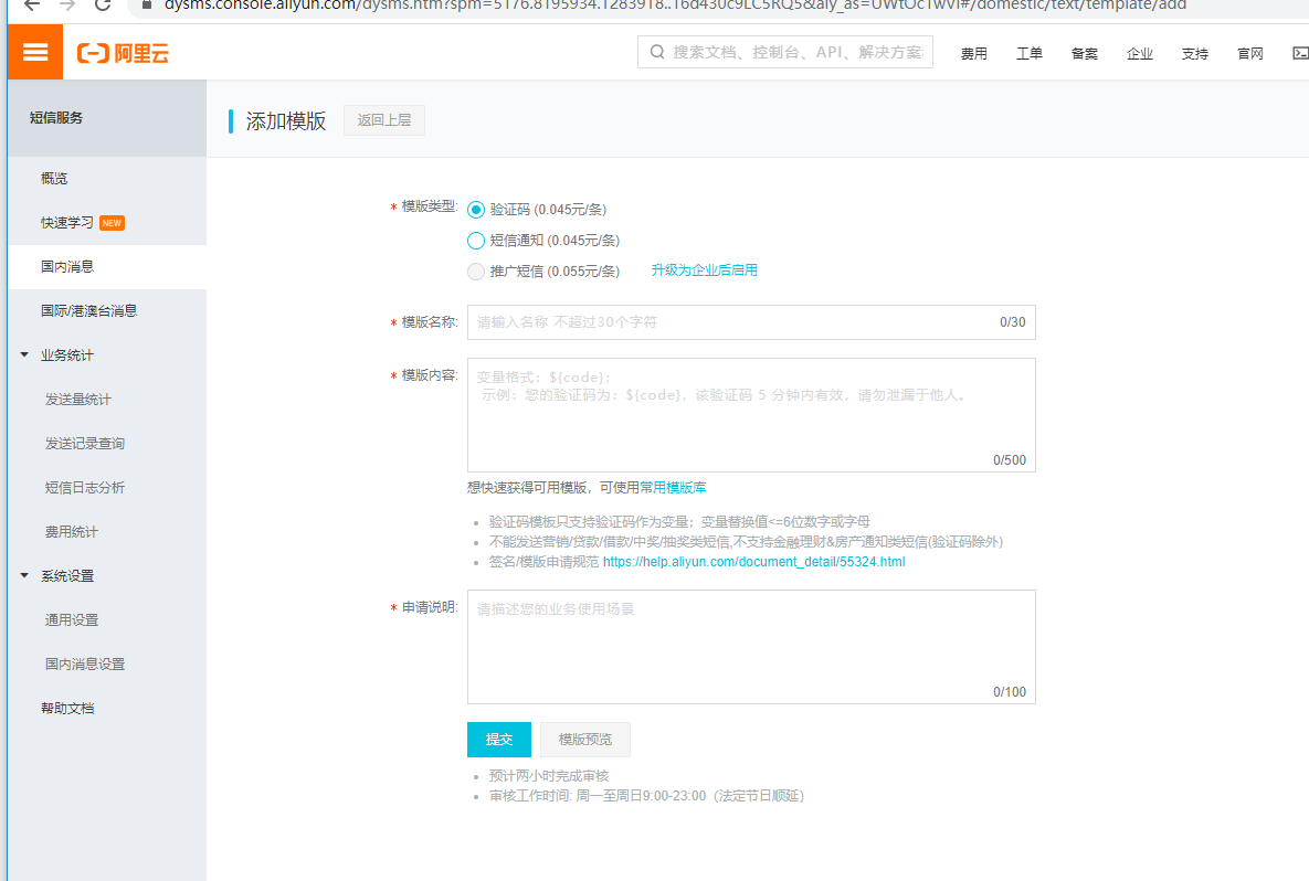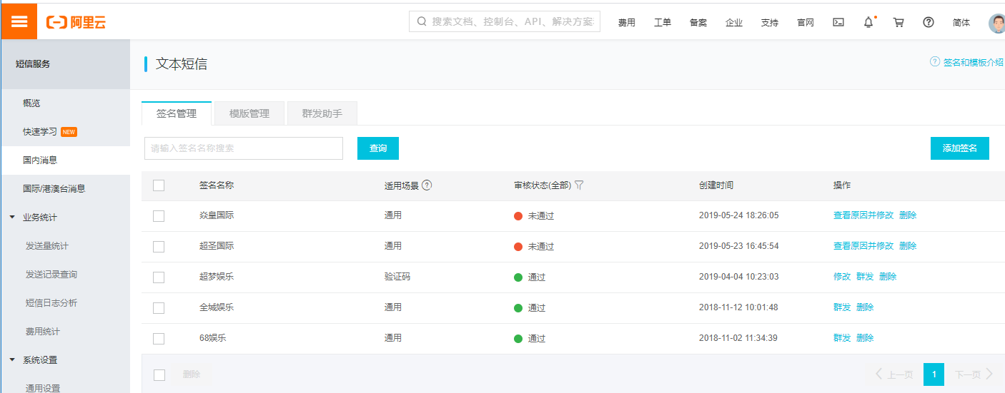 2.点进去就入管理控制台,然后按流程申请签名管理,模板管理
