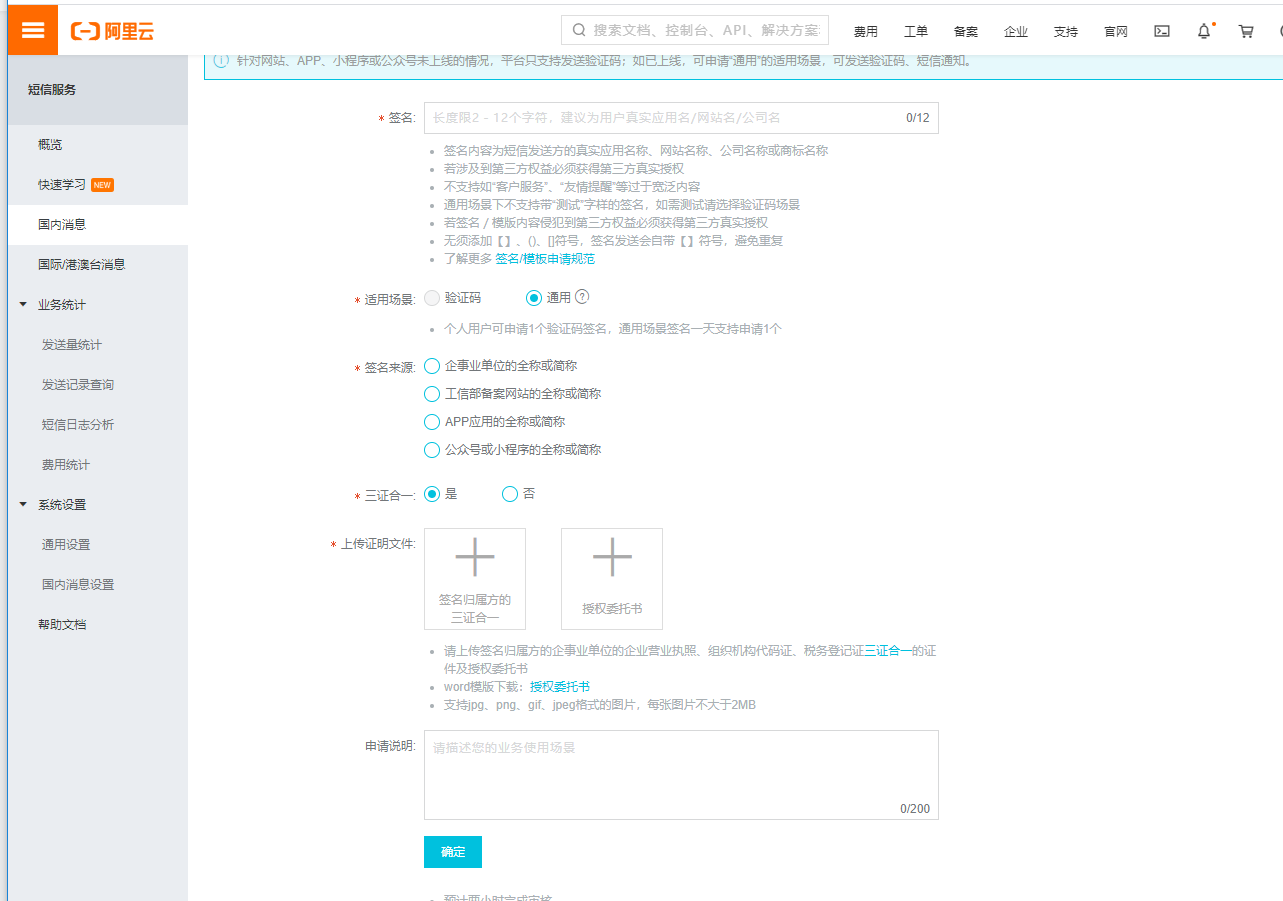 3.注意在申请短信签名管理的时候,这里会有个适用于场景,如果只是发送个验证码验证 ,只需将场景修改为验证码模式下就可以,审核条件较少,重要说明下 ,一个签名可以对应多个短信模板, 一个短信模板也可以搭配多条短信签名