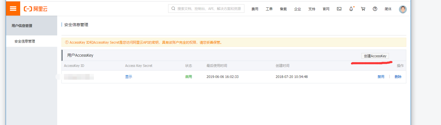 1,首先申请或者启用自己账号的AK以及密匙,点击AK管理,新账号下需要创建自己的AK,跟着提示走,申请之后保存好就OK·