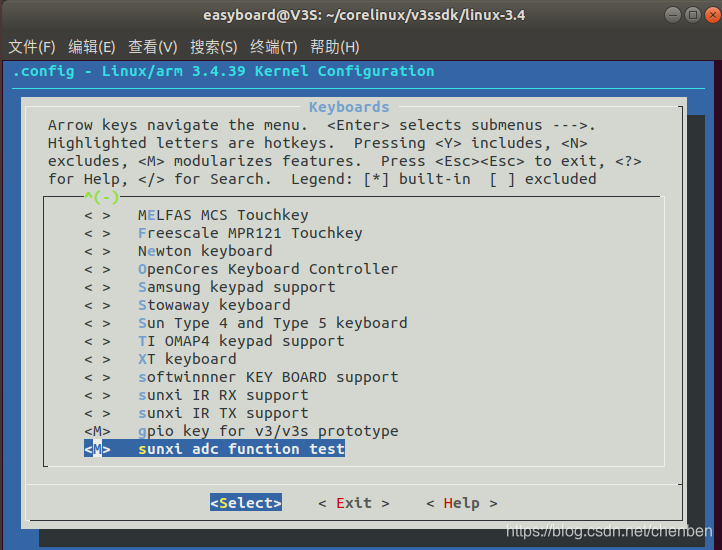 保存退出,然后编译内核,就得到了sunxi_adc.ko。同在\linux-3.4\drivers\input\keyboard\路径下。
