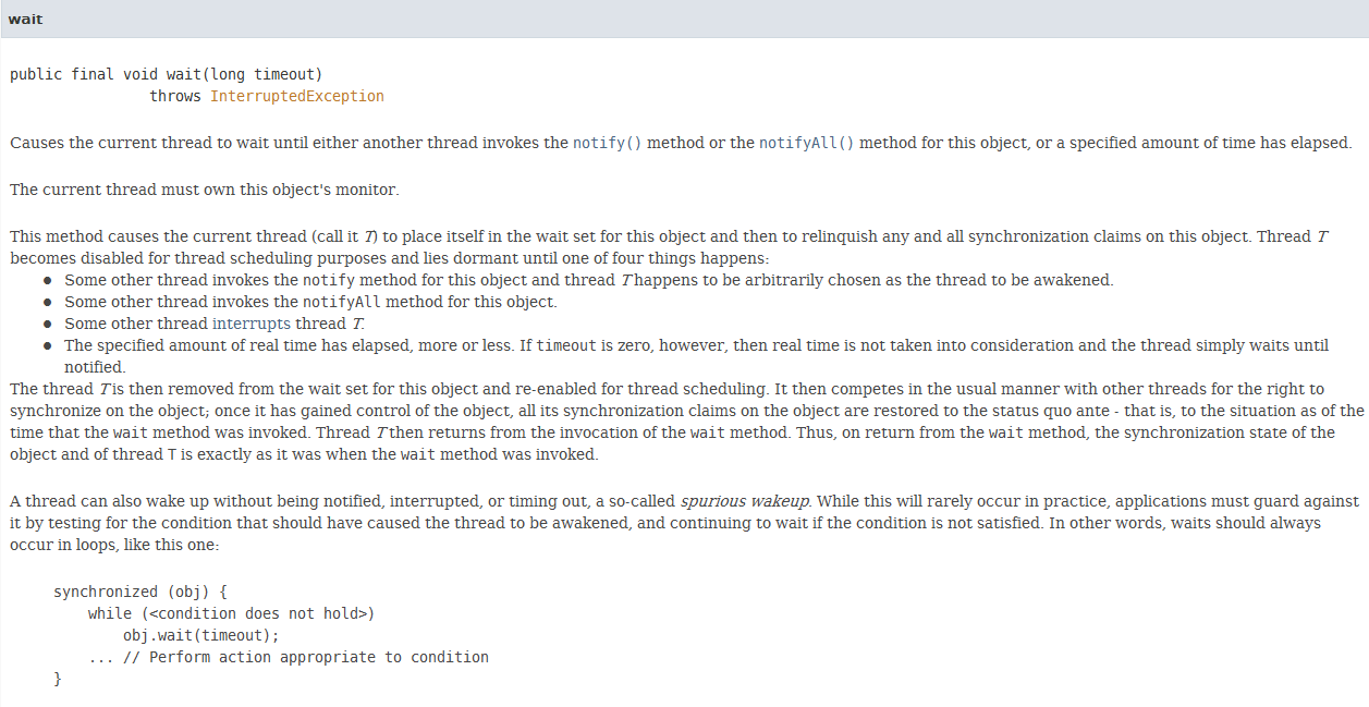 翻译一下,一个线程可以不需要notify来唤醒,可以被打断或超时,叫做虚假唤醒 虽然在实践中会很少发生,但是应用程序必须通过测试使线程唤醒的条件来预防这种现象 如果条件不满足,则继续等待。换句话说,等待应该总是循环发生