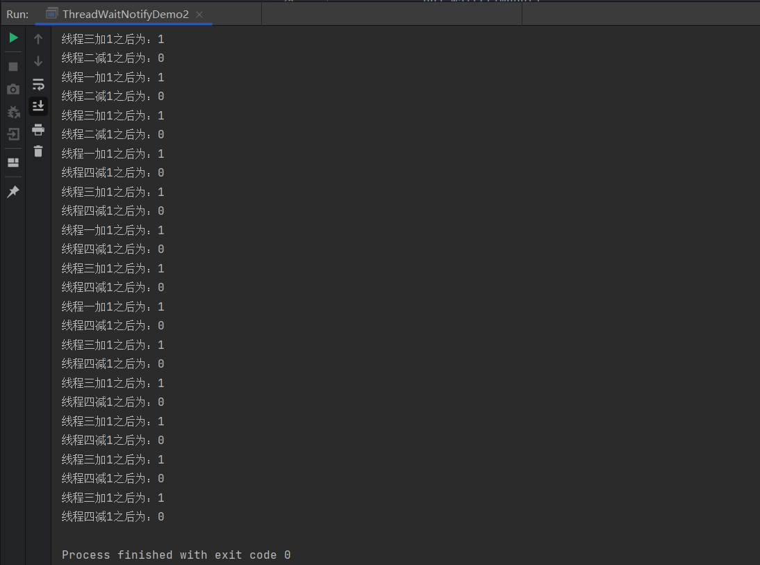 接着,我们添加两个线程,一共四个线程,其中两个线程做加法,两个线程做减法,四个线程交替执行,还来实现上面代码的过程,交替对数据加1或者减1,我们执行下面的代码