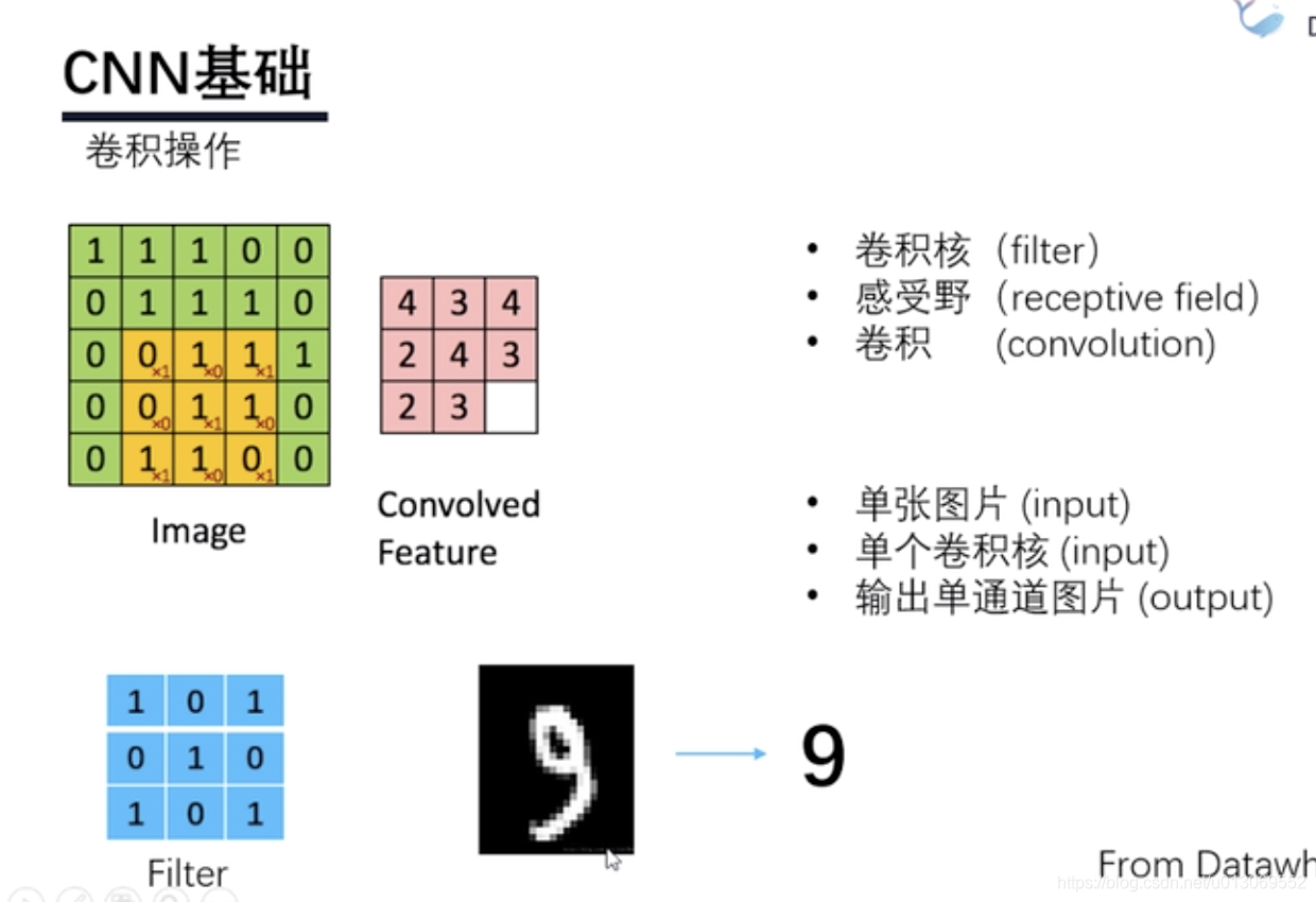 一个矩阵代表一个图像的表示,卷积核Filter对矩阵进行卷积(矩阵相乘再相加),得到卷积特征;