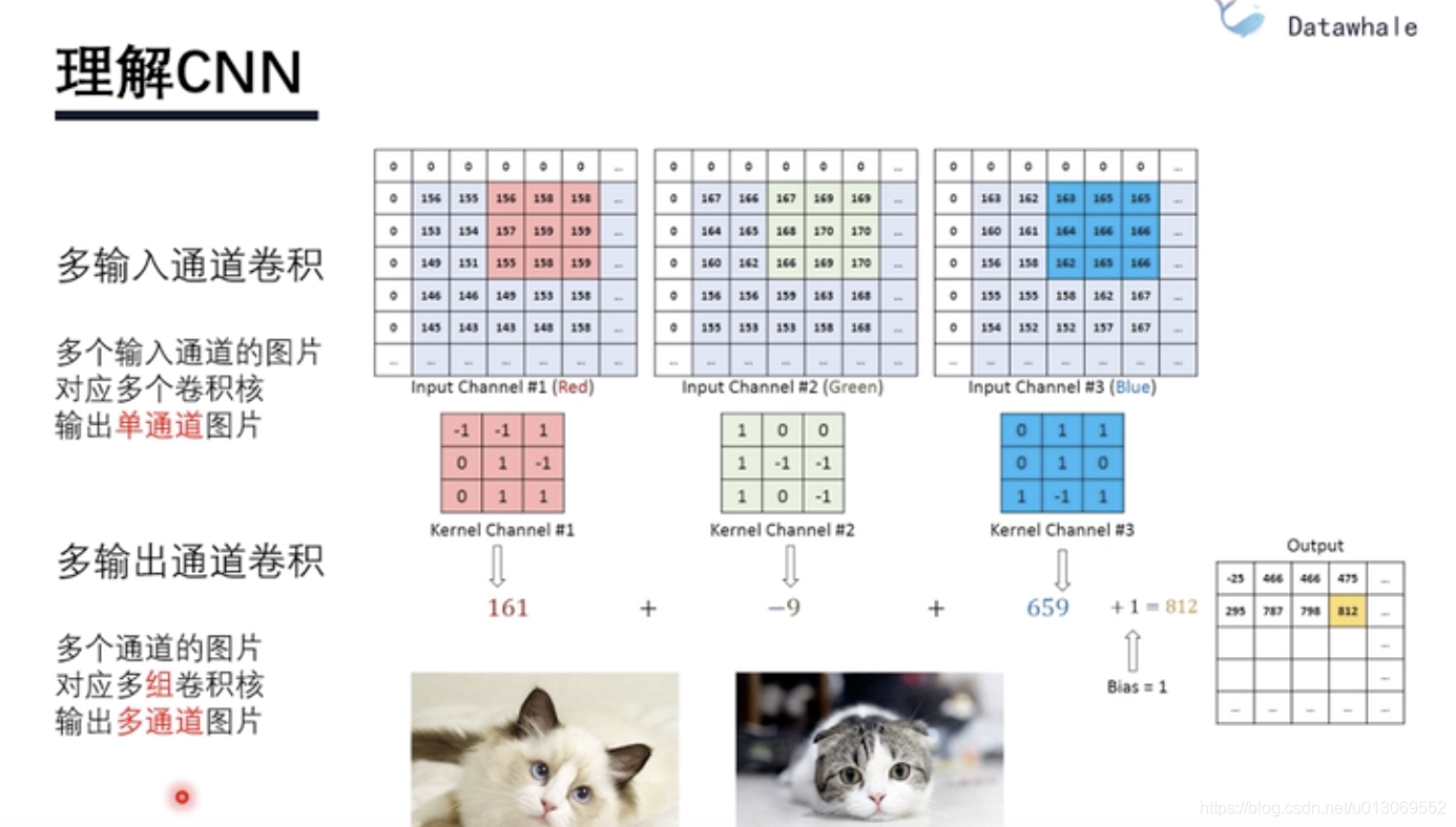 多个卷积核进行卷积,提取不同位置的特征;多通道特征相加;得到最后的卷积矩阵。