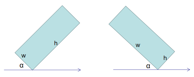角度为x轴顺时针旋转,第一次接触到矩形边界时的值,范围:0~90°,第一次接触的边界为宽,区分方向可以使用宽、高的值来确定。