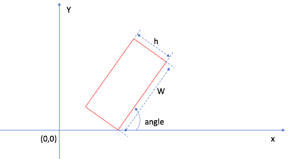 宽、高和角度定义如下:角度为x轴沿逆时针旋转遇到的第一个边时的旋转角度,因为是逆时针旋转所以角度为0~-90度。约定:遇到的第一个边为宽、另一个边为高。