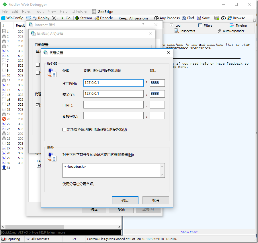 Fiddler是通过改写HTTP代理,让数据从它那通过,来监控并且截取到数据。当然Fiddler很屌,在打开它的那一瞬间,它就已经设置好了浏览器的代理了。当你关闭的时候,它又帮你把代理还原了,是不是很贴心。。。