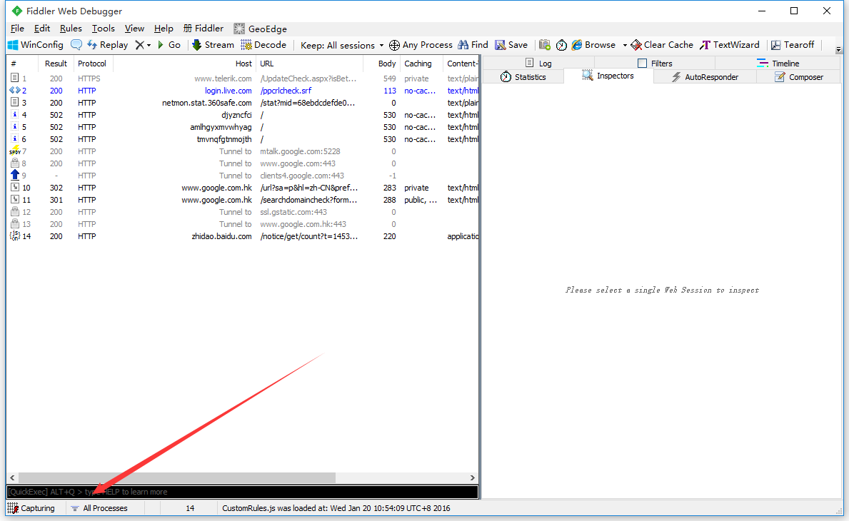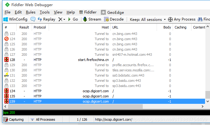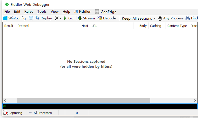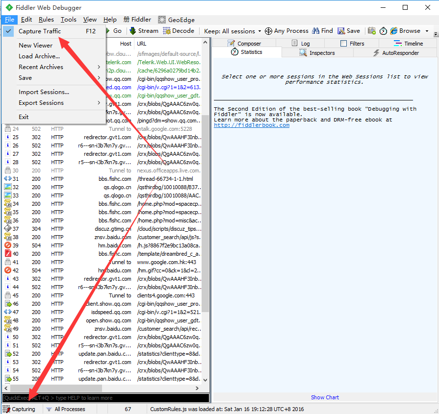 Fiddler想要抓到数据包,要确保Capture Traffic是开启,在File –> Capture Traffic。开启后再左下角会有显示,当然也可以直接点击左下角的图标来关闭/开启抓包功能。
