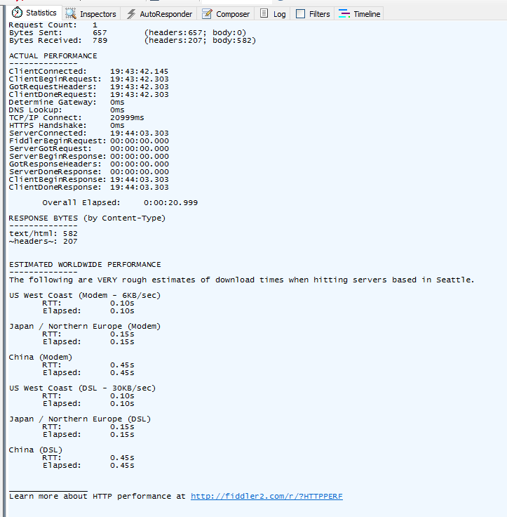 随意点击一个请求,就可以看到Statistics关于HTTP请求的性能以及数据分析了(不可能安装好了Fiddler一条请求都没有…):