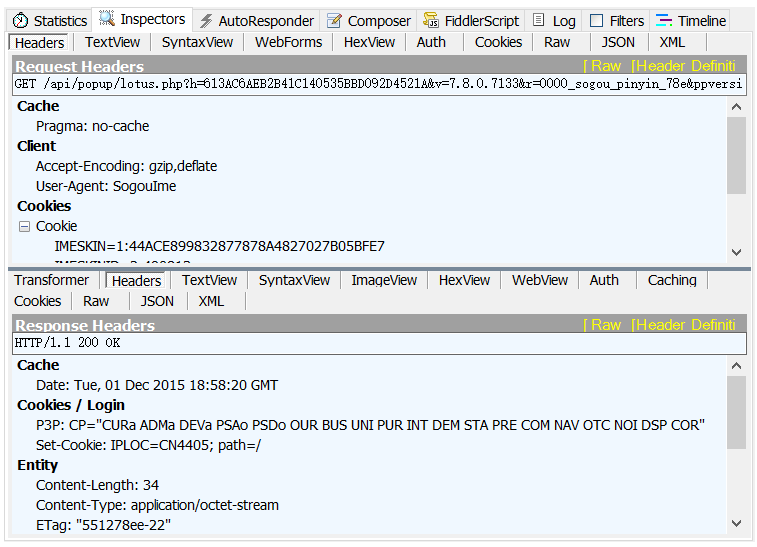 Inspectors是用于查看会话的内容,上半部分是请求的内容,下半部分是响应的内容: