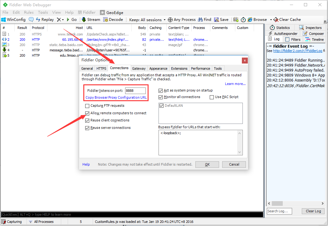 3. 点击 [Connections] ,设置代理端口是8888, 勾选 Allow remote computers to connect, 点击OK