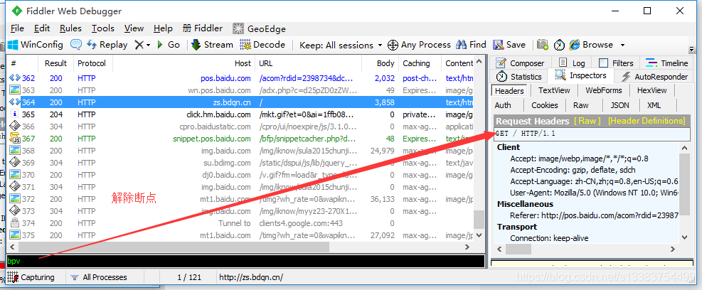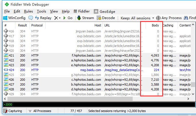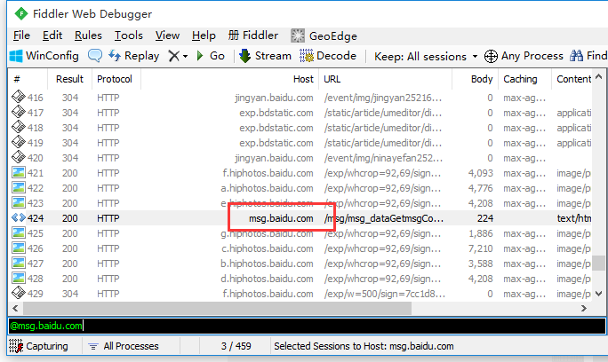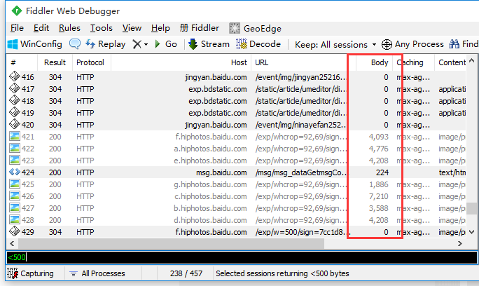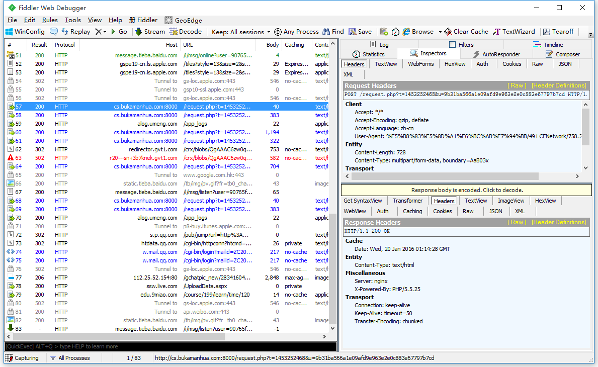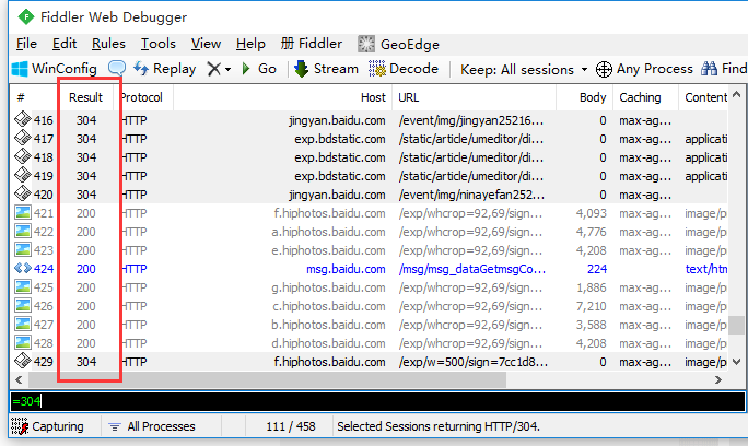 Fiddler开始工作了,抓到的数据包就会显示在列表里面,下面总结了这些都是什么意思: