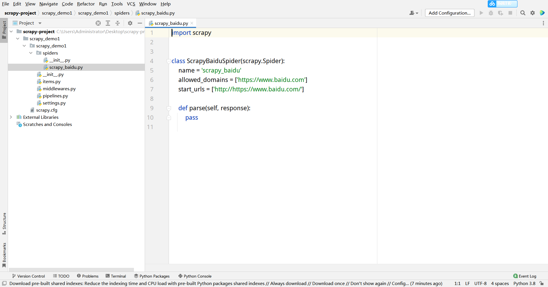scrapy genspider 爬虫文件的文件名 某个目的url文件名我们任意取,某个目的url我们这里可以用https://www.baidu.com来做演示,名称这里取的是scrapy_baidu。(注意爬虫文件名不能和项目名称一致)。于是我们生成了一个爬虫文件: