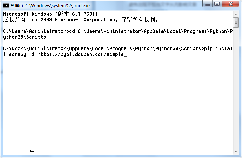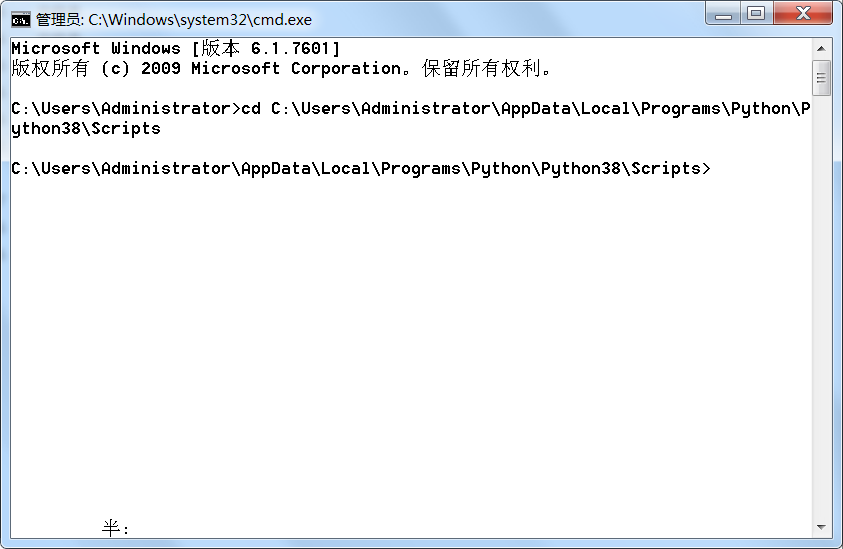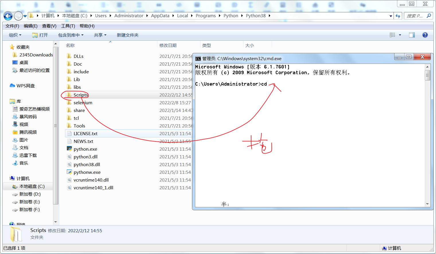 之后输入cd,留一个空格,之后把python安装目录下的Scripts文件夹拖入,生成路径,并回车确认: