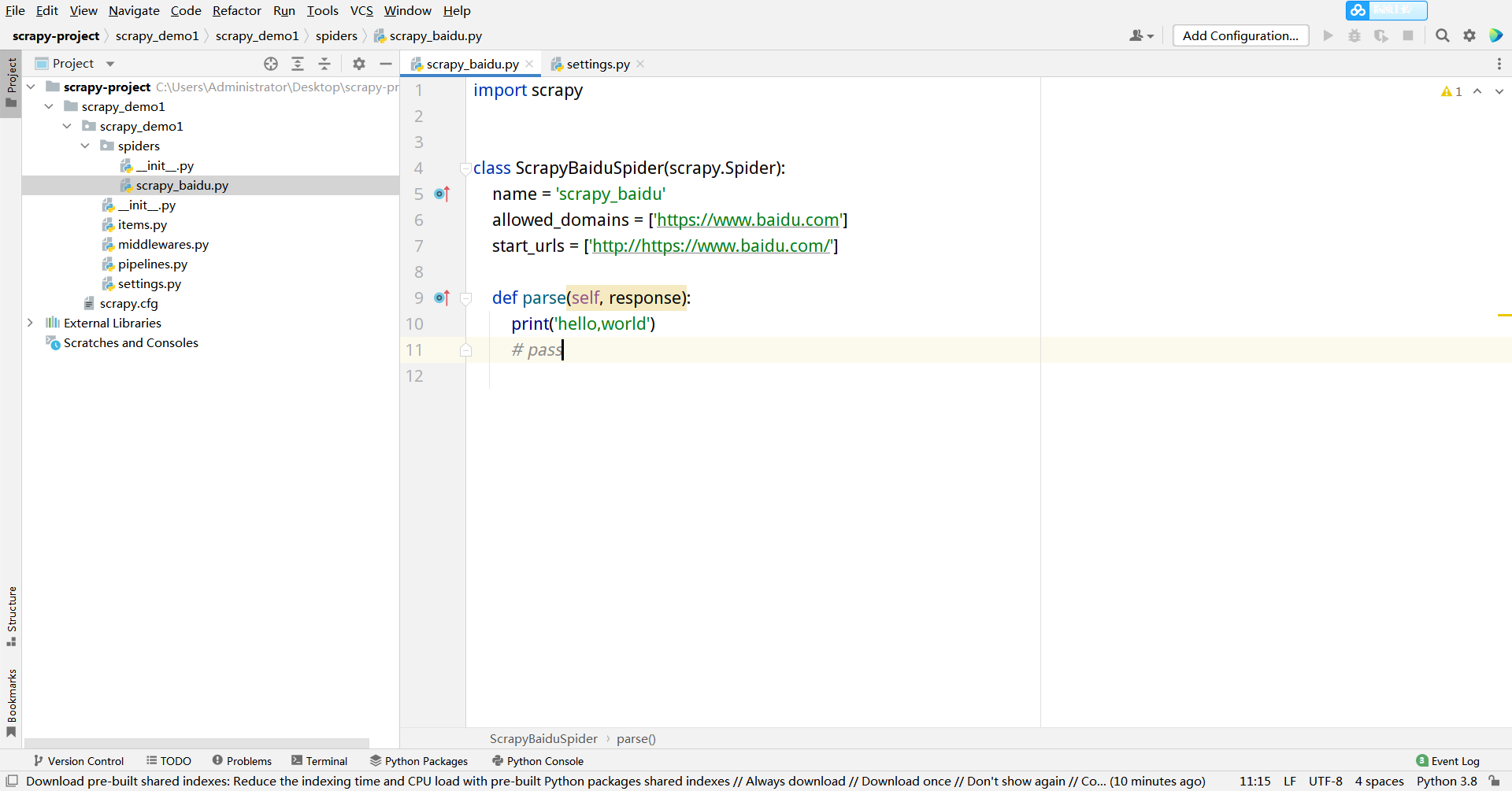 我们再次打开新建的爬虫文件:scrapy_baidu.py,注释掉parse函数下的pass,加上一句print代码,例如这里print一句'hello,scrapy'