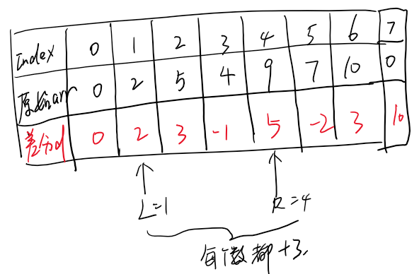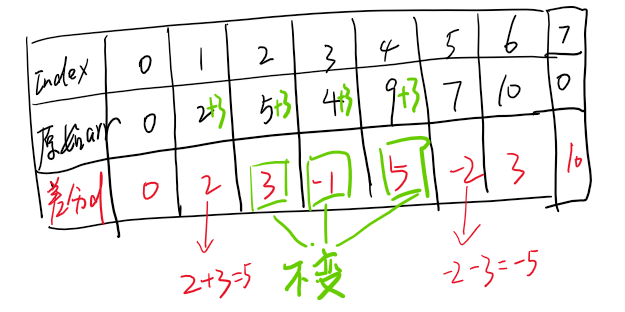 所以,例子中的arr数组其对应的差分数组值如下图所示。