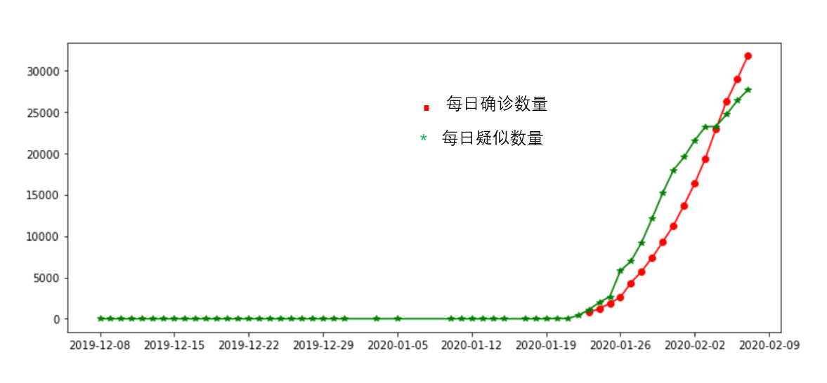 新型肺炎每日确诊和疑似比较数据,以及累计密切接触者数据引用国家官方实时通报数据。截至2020年2月8日.每日确诊和每日疑似数量如下图: 每日累计密切接触数据如下图: 版权声明:本文为robot_learner原创文章,遵循CC 4.0 BY-SA版权协议,转载请附上原文出处链接和本声明。原文链接:https://blog.csdn.net/robot_learner/article/details/104230639