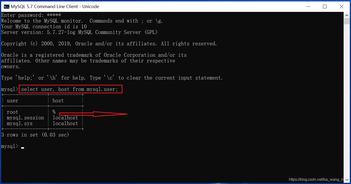 6、再次使用如下命令查看数据库各个用户的访问权限