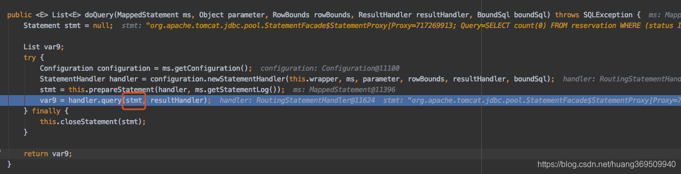懒得加配置,想直接调式看下,找到在SimpleExecutor下的doQuery方法。这个会显示?替换为参数的最终sql语句。