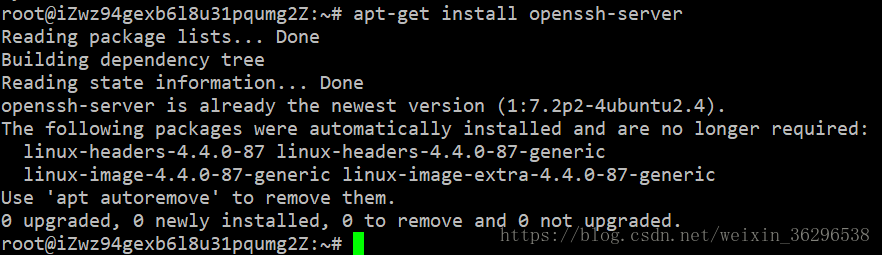 由于我的Ubuntu服务器已经安装好了SSH,所以提示我无需安装。安装好后,我们需要启动一下SSH服务。