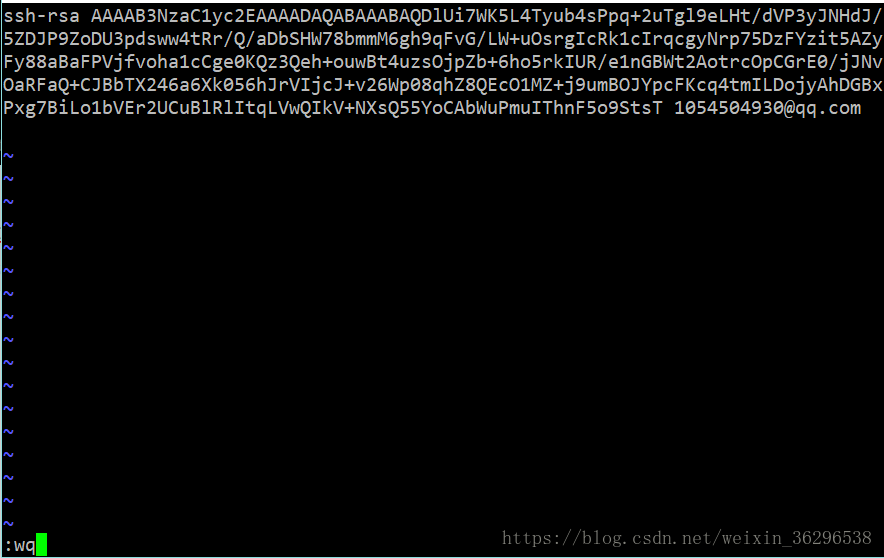 使用vim编辑器打开.ssh目录下的authorized_keys,并且将本地的id_rsa.pub内容复制进去,如有多个公钥则换行即可,并使用wq命令保存退出。