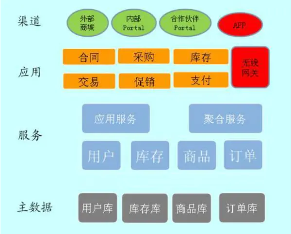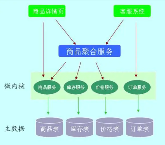 每个企业都有自己的核心数据,比如对于电商系统来说,用户/商品/订单/库存/价格都是核心数据,称之为主数据。微内核SOA聚焦各类主数据,封装相关表的所有访问,架构示意如下: