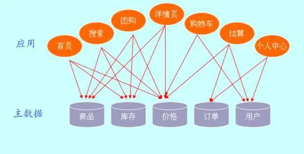 面向企业外部SOA,业务场景有特殊性,不深入分析,这里主要比较面向应用SOA和微内核SOA的区别,一个大型B2C电商系统,应用和主数据是多对多依赖关系,如下图所示: