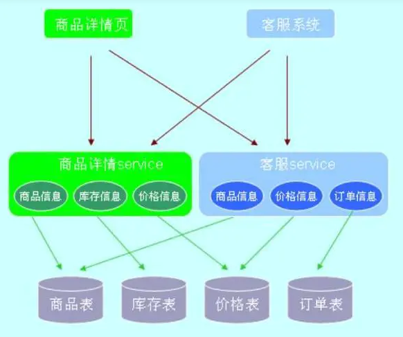 举一个电商的例子,这里有两个应用,顾客使用的商品详情页,展示商品的信息、商品库存,商品价格;内部客服人员使用的客服系统,根据顾客来电要求,修改订单,同时也需要获取商品的基本信息、价格信息等。