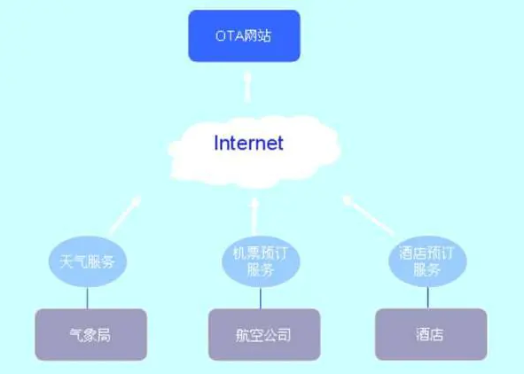 每个公司把自己的优势资源通过web service发布,如图中天气服务/机票服务/酒店预订服务来自不同公司,其他企业可以直接调用服务或整合多个服务,实现企业间资源共享。